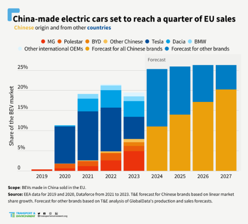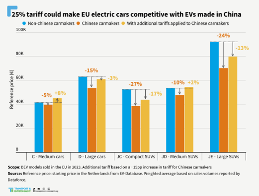 En relación a esto, el aumento al 25 % de los aranceles de la Unión Europea sobre todas las importaciones de vehículos procedentes de China encarecería las berlinas y todoterrenos de tamaño medio frente a sus equivalentes europeos, lo que favorecería la fabricación en la UE, frente a los SUV compactos y los coches más grandes importados de China que seguirían siendo ligeramente más baratos con ese arancel. "La UE no debería proteger a sus fabricantes de automóviles de una competencia significativa, lo que limitaría la oferta de coches eléctricos asequibles para los europeos. Es crucial que una tarifa más alta vaya acompañada de un impulso normativo", señalan desde T&E.