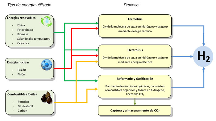 El hidrógeno es el elemento químico más abundante que existe en el universo pero no se encuentra en estado libre sino que está combinado con otros elementos, por lo que no se trata de un recurso natural, sino de un vector energético. El hidrógeno puede ser producido a partir de una amplia gama de fuentes de energía como el agua, los combustibles fósiles o la biomasa, entre otros, a través de diferentes procesos según sea la materia prima y la fuente energética utilizada. Los principales procesos para obtenerlo son la electrólisis, gasificación, reformado, procesos biológicos o termólisis. Por la diversidad de los recursos a partir de los que se puede producir, la utilización del vector hidrógeno implica mayor seguridad de abastecimiento y mayor acceso a la energía.