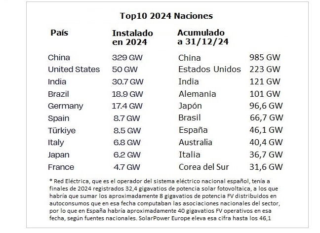 [Bajo estas líneas, Top10 Naciones de 2024, según SolarPower Europe. Dos criterios: potencia y vatios por habitante].