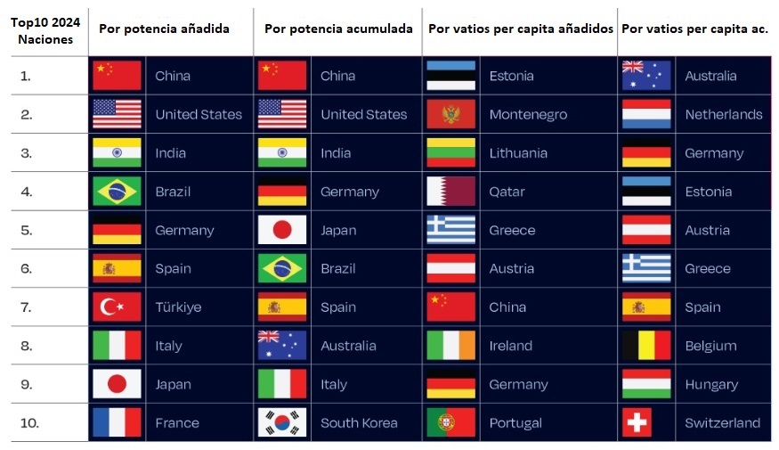 El resto del mundo, el 19% restante, o sea, 116 gigavatios (GW). Australia y Países Bajos caen en 2024 del Top10, si bien siguen mostrando buenos registros en todos los criterios.