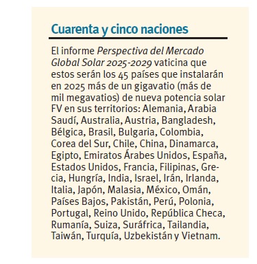 Ambos guarismos palidecen no obstante si atendemos a las previsiones de SolarPower Europe. Porque, según este su último informe, en 2025 serán hasta 45 las naciones que conecten más de un gigavatio de potencia.