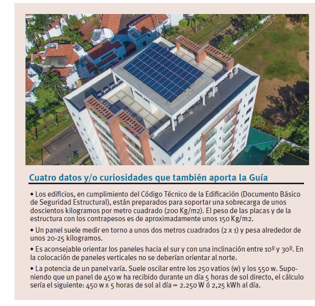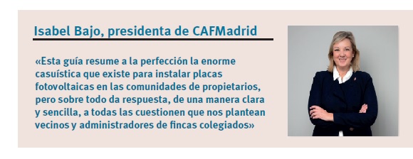 ¿Objetivo de la Guía? Disipar las dudas que asaltan a los administradores de fincas a la hora de abordar el despliegue de instalaciones solares fotovoltaicas para autoconsumo en los inmuebles que administran... Disipar las dudas de los administradores de fincas... pero también resolver las de cualquier persona interesada en la cuestión. CAFMadrid ha elaborado, en colaboración con el IDAE, la fundación Fenercom (Comunidad de Madrid), Madrid 360 Solar (iniciativa del ayuntamiento capitalino), la oenegé Madrid Futuro y el asesor técnico Martín Ponsá, una Guía que contesta a 10, 20, 30... y hasta 55 preguntas y/o dudas. El documento que ha elaborado CAFMadrid abre su página 2 con una suerte de exposición de motivos. “Los altos precios energéticos –dice– hacen que las comunidades de propietarios se planteen cada vez más la instalación de placas fotovoltaicas para reducir el gasto en electricidad (...) y en España existe suficiente luz solar como para que cualquier instalación fotovoltaica sea rentable”. Tan rentable como que la amortización de estas instalaciones –precisa la Guía– suele oscilar entre los 4 y los 7 años, período tras el cual “todo sería ahorro”, un ahorro que se prolongará durante décadas, pues la vida útil de una instalación de estas características ronda los 25-30 años.