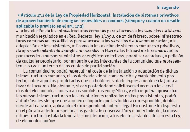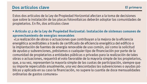Si es para autoconsumo de la comunidad, dependiendo del importe de la instalación, será aplicable lo dispuesto en el artículo 17.2 (mayoría simple) o el artículo 17.1 (1/3 de la totalidad de propietarios y cuotas) [Abajo, a la derecha, recogemos ambos artículos]. Si es para uso privativo de los propietarios, será aplicable el artículo 17.1 (un tercio de la totalidad de propietarios y cuotas).
