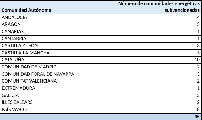 La primera convocatoria de ayudas para proyectos piloto de comunidades energéticas (programa CE IMPLEMENTA), dirigida a proyectos de pequeño tamaño cuya inversión no supere el millón de euros, se ha resuelto con un total de 45 proyectos beneficiarios, que contemplan más de 230 actuaciones en 14 comunidades autónomas y movilizarán una inversión de 14,7 millones de euros. Se trata de la primera convocatoria de ayudas a nivel estatal específica para comunidades energéticas, puesta en marcha para impulsar la innovación social y la participación ciudadana en renovables, eficiencia energética o movilidad eléctrica.