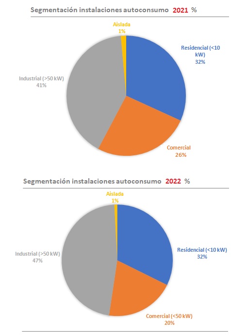 Por su parte y según el estudio que realiza la Unión Española Fotovoltaica de manera anual, la asociación sectorial considera que habría ya en torno a 200.500 instalaciones residenciales con autoconsumo en España. Eso sí, el sector que más ha incrementado en 2022 su porcentaje de instalación, del 41% al 47%, ha sido el industrial.