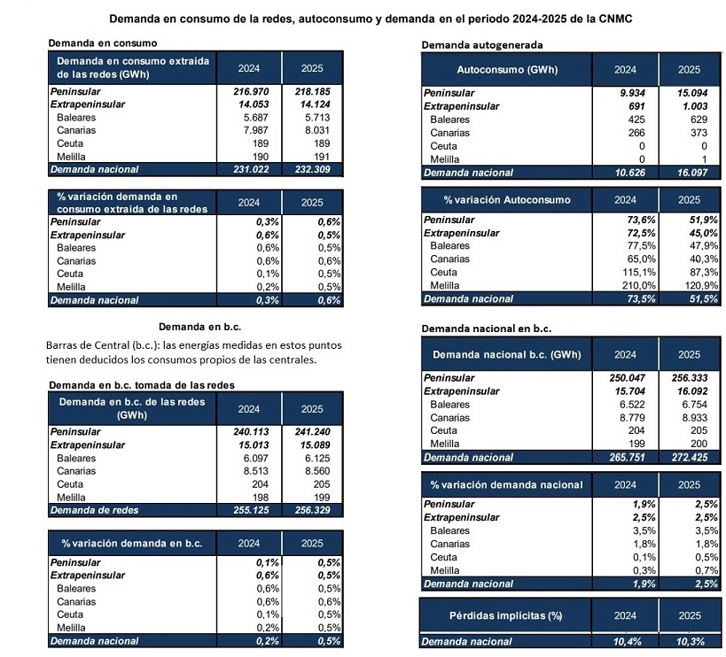 El cuadro que aparece junto a estas líneas presenta las previsiones de la CNMC relativas a la demanda en consumo y en barras de central (b.c.), desagregadas por subsistema (peninsular, extrapeninsular) y distinguiendo entre la demanda suministrada desde las redes y demanda autogenerada, así como la evolución de las pérdidas medias previstas. “Cabe señalar –concluye la CNMC- que, si bien se estiman incrementos relevantes de la demanda nacional, motivado por el proceso de electrificación de la economía, estos incrementos no se traducen en incrementos de energía suministrada desde las redes, debido a la penetración del autoconsumo, que se estima alcanzará el 5,9% en 2025”.