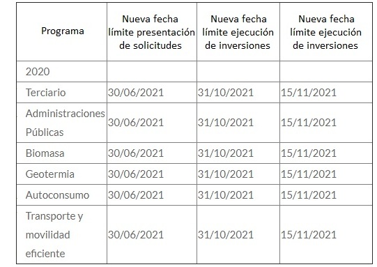 Concretamente, las ayudas que verán modificados sus plazos -informa el EVE- son las que están dirigidas al sector terciario y a las administraciones públicas; al de apoyo a las renovables como la biomasa, la geotermia y la producción eléctrica para autoconsumo, así como las ayudas a inversiones en movilidad eficiente. Esta ampliación de plazos es aplicable tanto a los proyectos nuevos que se presenten a la correspondiente línea de subvención como a los que ya hayan recibido resolución de concesión de la ayuda.