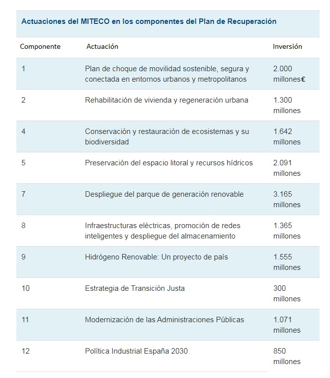 Estas actuaciones se enmarcan en el Plan de Recuperación, Transformación y Resiliencia, del que el Miteco gestionará 15.339 millones de euros, el 21,95% del total. De este presupuesto, 5.390 millones irán destinados a actuaciones vinculadas a energía en ámbitos como movilidad eléctrica, rehabilitación energética y regeneración urbana en municipios de menos de 5.000 habitantes, despliegue del parque de generación renovable, promoción de redes inteligentes, despliegue de la flexibilidad y el almacenamiento, hidrógeno renovable, transición justa y eficiencia energética y movilidad sostenible en la Administración General del Estado.