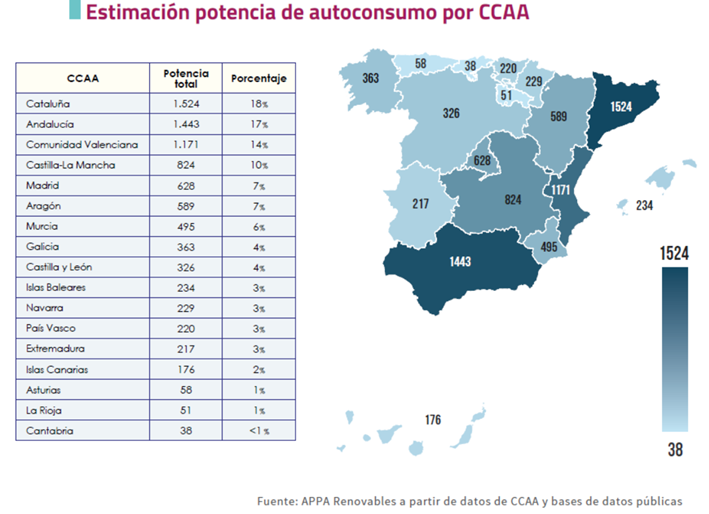 Por primera vez, el Informe incorpora una estimación de la potencia instalada actualmente en las distintas Comunidades Autónomas. Esta información, obtenida de forma directa de los registros de aquellas regiones que los tienen actualizados y utilizando la información de bases de datos públicas para completar la información, muestra un gran desequilibrio entre las diferentes comunidades. Sólo contabilizando tres Comunidades Autónomas: Cataluña, Andalucía y Comunidad Valenciana, se contabiliza cerca de la mitad de la potencia instalada en todo el territorio nacional.