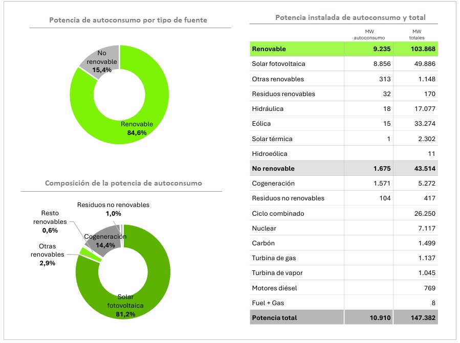 La principal fuente verde de autoconsumo es la solar fotovoltaica, con 8.856 MW de potencia instalada, que acapara el 81,2% de la capacidad de este tipo y el 17,7% de toda la fotovoltaica conectada al sistema. A mucha distancia, se encuentra el grupo de otras renovables (fundamentalmente, biomasa y biogás), con 313 MW, y los residuos renovables, con 32 MW, además de cantidades poco significativas en otras energías como la hidráulica (18 MW), la eólica (15 MW) y la solar térmica (1).