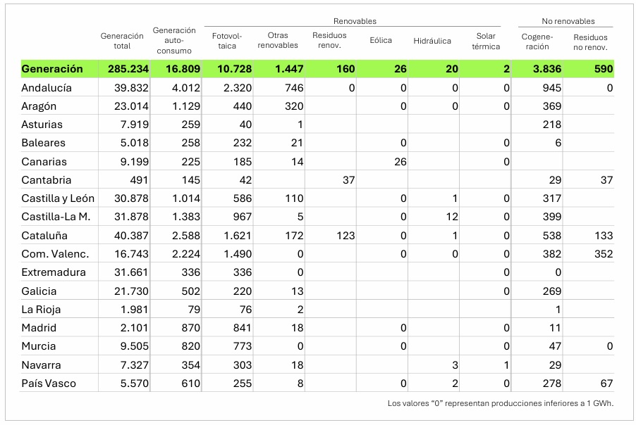 Desde el punto de vista territorial, la generación de autoconsumo renovable se concentró sobre todo en Andalucía, Cataluña y la Comunidad Valenciana, que lideraron el ranking, con 3.067 GWh, 1.917 y 1.490, respectivamente. Entre las tres comunidades concentran más de la mitad (52,3%) de la producción renovable de autoconsumo del país. En el extremo opuesto, se ubican regiones como La Rioja (78 GWh) o Asturias (42 GWh).