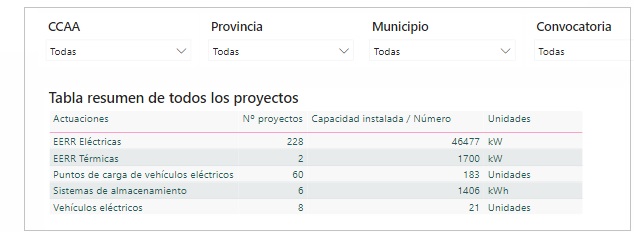 * Tablas resumen con potencias de energías renovables, número de puntos de recarga o de vehículos eléctricos, etc., a implementar e implementados, que se pueden filtrar por comunidad autónoma, provincia, municipio y convocatoria de Implementa.