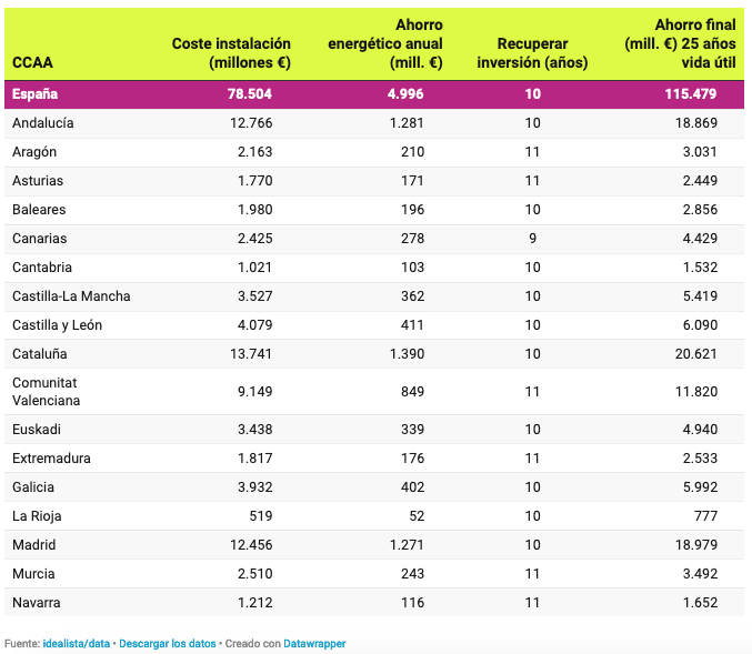 En cuanto al ahorro total obtenido, una vez amortizada la instalación, durante los 25 años de vida de los paneles, Cataluña lidera el ranking, con una capacidad teórica de ahorrar 20.621 millones de euros en estos años. Le siguen Madrid (18.979 millones), Andalucía (18.869 millones), Comunitat Valenciana (11.820 millones), Castilla y León (6.090 millones), Galicia (5.992 millones), Castilla-La Mancha (5.419 millones) y Euskadi (4.940 millones).