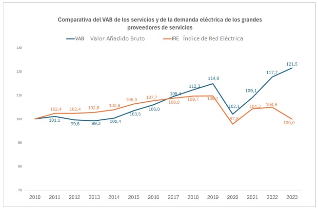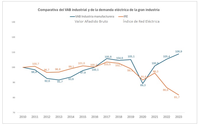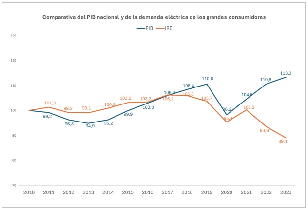 "Sí, es generalizado". La demanda a la red desciende en todos los sectores empresariales de medianas y grandes empresas, según los datos de Redeia. Sin embargo, hay diferencias sustanciales: mientras la demanda industrial a la red ha descendido un 18, % respecto al indicador de 2010, la de los grandes servicios se ha ido reduciendo en los últimos años hasta igualarse al nivel de 2010. "Una posible lectura -apuntan los expertos consultados por FIE- es que la industria aplica antes las medidas de eficiencia energética y el autoconsumo".