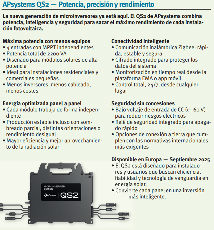 En septiembre de 2025, APsystems lanzó en Europa del microinversor QS2, un dispositivo monofásico de cuatro entradas diseñado para responder a la creciente demanda de módulos fotovoltaicos de alta potencia.