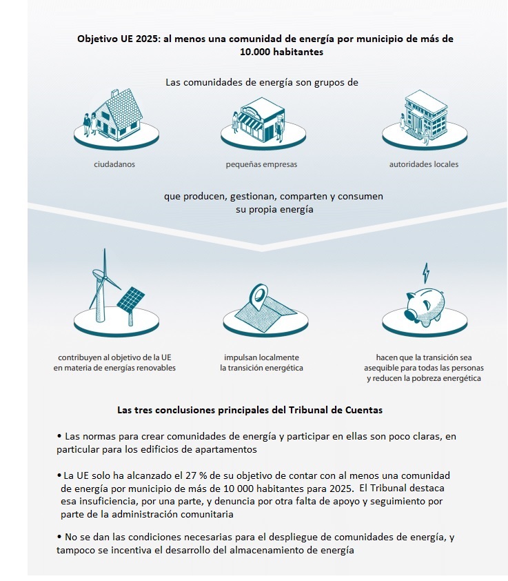 Mensaje directo, inequívoco, en cuatro disparos: (1) "los obstáculos técnicos y jurídicos ralentizan el sueño de una revolución energética de la UE en el ámbito local". (2) El número de comunidades de energía y su contribución a la generación de energía verde "no terminan de arrancar realmente". (3) "La falta de claridad de las directrices de la UE limita una participación más amplia de las asociaciones de propietarios de edificios de apartamentos" (bloques de viviendas). Y (4) "Los retrasos en las conexiones a la red y la falta de incentivos para el almacenamiento lastran los proyectos de las comunidades de energía". Son los cuatro mensajes que destaca el Tribunal de Cuentas de la Unión Europea en el informe que acaba de publicar sobre comunidades energéticas: Informe Especial 10/2026, «Comunidades de energía – Todavía no se ha logrado todo su potencial».