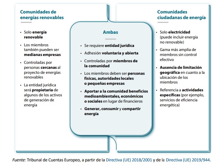 [Bajo estas líneas, las dos comunidades energéticas que contempla la legislación europea: la Comunidad de Energías Renovables (Directiva 2018/2001 del Parlamento Europeo y del Consejo de 11 de diciembre relativa al fomento del uso de energía procedente de fuentes renovables) y la Comunidad Ciudadana de Energía (Directiva 2019/944 del Parlamento Europeo y del Consejo de 5 de junio sobre normas comunes para el mercado interior de la electricidad)].