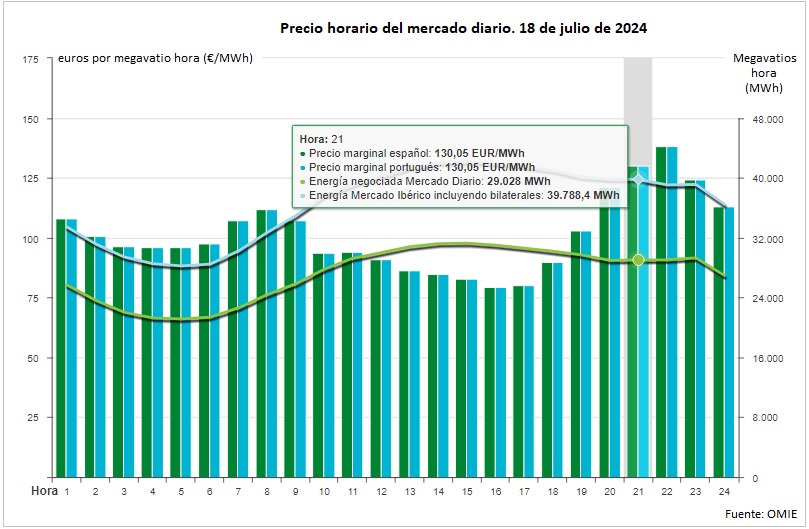 A la vez, a esas mismas horas (las centrales), en el mercado mayorista, el megavatio hora de electricidad cotiza entre los 79,21 euros de las cuatro de la tarde (ese es el precio de la luz entre las 16.00 y las 17.00 horas hoy en el pool) y los 90,18 euros del mediodía (a las 21.00 horas, cuando aún no se ha retirado el Sol del horizonte, el precio del megavatio hora de electricidad estará por encima de los 130 euros). ¿Precio medio del megavatio hora en el mercado mayorista diario de España para hoy? 101,37 euros. El pool fija hoy así el segundo precio más alto de todo el año (el primero quedó registrado el pasado 9 de enero, con 113,83 €/MWh).