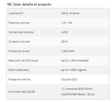 Dos son los protagonistas de esta historia. El primero, sin duda, es la Cooperativa Eléctrica Benéfica Catralense, que nació a mediados de los años 20 a partir de participaciones de 25 pesetas y como respuesta-reacción a dos estímulos: la creciente demanda eléctrica local y el "elevado precio -explican desde su página corporativa- que imponían las grandes compañías eléctricas que dominaban el sector en aquella época". Pues bien, la Catralense abastece hoy, 94 años después, a cerca de 4.000 hogares (distribuye y comercializa electricidad en todo el municipio). ¿Y el otro protagonista? La empresa IBC Solar, mayorista y proveedora de soluciones y servicios fotovoltaicos y para el almacenamiento de energía. Ambos están impulsando la puesta en marcha de una instalación de "Autoconsumo Colectivo" (de 1,8 megavatios de potencia) en el pequeño municipio alicantino. IBC, que se ha hecho cargo del suministro de los equipos y el desarrollo técnico, prevé que la instalación esté lista en diciembre. La instalación, denominada Villa de Catral, estará integrada por más de 4.000 paneles solares (estructura hincada sobre suelo) y una docena de inversores SMA Sunny HighPower Peak3, 150-20.