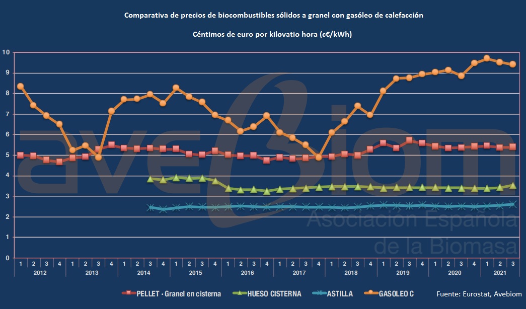 Avebiom considera que el objetivo que sobre el particular ha fijado el Gobierno en este Plan es "poco ambicioso", e insiste en que, según el proyecto europeo Agrobioheat, "las cifras podrían triplicarse si se movilizasen biomasas de origen agrícola como las podas de frutales, la paja de cereal o el hueso de aceituna, entre otras". [Bajo estas líneas, la evolución de los precios de diferentes combustibles a lo largo de los diez últimos años].