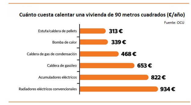 Por su parte, la OCU ha elaborado recientemente una comparativa entre sistemas de calefacción para una vivienda de 90 metros cuadrados en una región fría. Se sitúan en cabeza con claridad los equipos de pellets, seguidos de las bombas de calor y el gas natural.