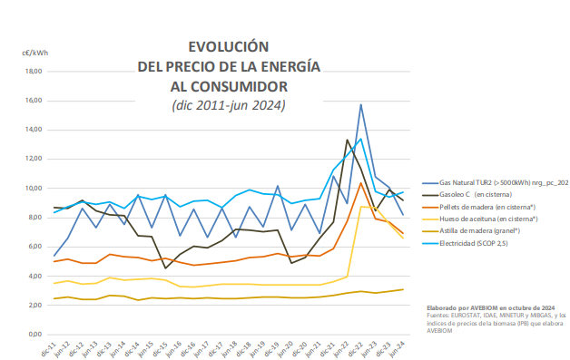 Se han utilizado datos procedentes de Eurostat, IDAE, Minetur y Mibgas, y los índices de precios de la biomasa (IPB) que elabora Avebiom de forma trimestral desde 2012 para pellet de madera, astilla y hueso de aceituna.