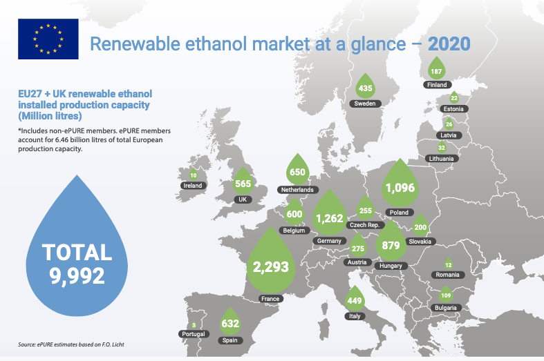 La asociación ePURE representa a 35 miembros (incluidos 19 productores) con alrededor de 50 plantas en la UE y el Reino Unido, que representan en torno al 85% de la producción de etanol renovable de la UE.
