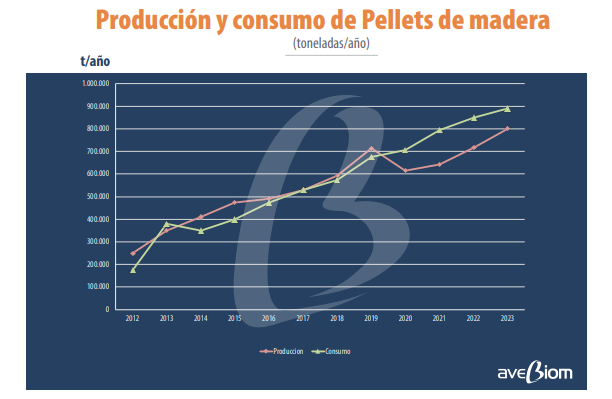 Fabricación y consumo de pellets siguen aumentando en España. En 2022 ya se recuperó el ritmo de producción prepandemia, igualando el récord de 2019 con 716.000 toneladas puestas en el mercado, y según las estimaciones del informe estadístico sobre la situación del mercado del pellet en España de la Asociación Española de Valorización Energética de la Biomasa (Avebiom), el 2023 se cerró con una producción real de 800.000 toneladas. En el mismo sentido ha evolucionado el consumo, que llegó a las 850.000 toneladas en 2022, y ha aumentado en 2023 hasta las 890.000 toneladas, siendo la calefacción residencial la que más consume pellets (565.000 toneladas). Según los datos de Avebiom, "las curvas de producción y consumo tiendan a acercarse".