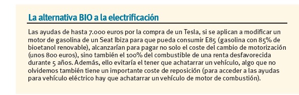 En ese marco, en España, la Administración, sorprendentemente, grava más al bioetanol (que es el biocombustible que podríamos producir con materia prima autóctona) que a la gasolina. Más aún, paradójicamente, cuanto más renovable es el combustible (E85, 85% de bioetanol, 15% de gasolina) más gravado está (60,8 euros por megavatio hora de contenido energético), frente a los 29,8 euros del E10 (que solo lleva un 10% de bioetanol) o los 27,7 euros del E5 (cinco por ciento de contenido bio).