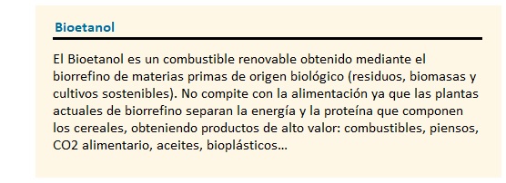 • El nuevo biorrefino concentra la proteína de los cereales cultivados en Europa para hacerlos competitivos frente a la soja importada (la soja tiene una concentración proteica más alta y estaba desplazando la utilización de nuestros cereales en la fabricación de piensos). Al caso: el biorrefino separa el almidón del cereal (el almidón aportaría un exceso de grasa a la carne animal) y lo convierte en bioetanol (y lo que no es almidón queda para pienso). El biorrefino europeo de cereal produce así más alimentos que biocarburante.