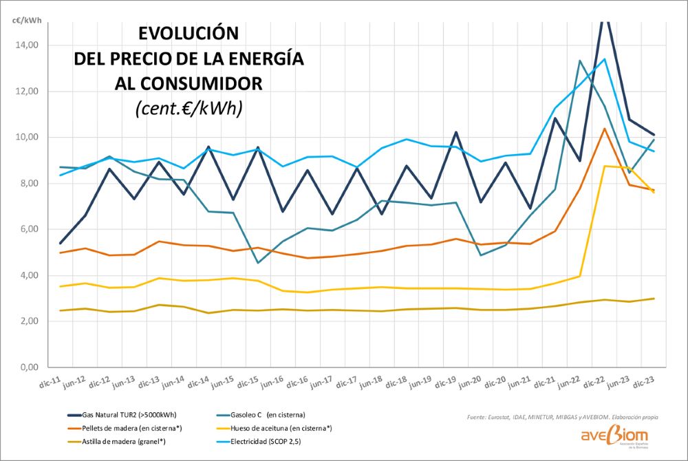 La Asociación Española de la Biomasa (Avebiom) ha realizado un análisis comparativo de los precios de distintos biocombustibles sólidos como el pellet certificado ENplus, la astilla de madera y el hueso de aceituna y de otras fuentes de energía disponibles en España, y su comportamiento lo largo de los últimos 10 años. El precio de la electricidad para un consumo medio (2500 - 5000 kWh) es significativamente más elevado que el del resto de fuentes de energía, con un incremento sostenido a lo largo del tiempo y un pico significativo de 30,71 cent€/kWh en junio de 2022. Incluso cuando se utiliza para alimentar una bomba de calor, y considerando un SCOP realista para el centro de la península de 2,5, se sitúa en la franja de los precios más elevados para calefacción doméstica.