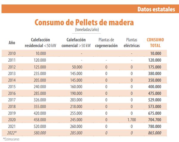 En este informe se pueden encontrar datos de producción y de consumo de pellets de madera tanto a nivel nacional como por comunidades autónomas. La crisis energética que comenzó en 2020 parece enquistarse y muchos ciudadanos y empresas de toda la UE han hecho realidad la opción del cambio de tecnología durante los últimos meses. Así, en paralelo al incremento récord del 40% en la instalación de estufas y calderas ocurrido en España durante 2021, también ha aumentado el consumo de pellets en un 13,5%. En total son 780.000 toneladas repartidas entre calefacción residencial de menos de 50 kW con un consumo de 520.000 toneladas y calefacción comercial (superior a 50 kW) con 260.000 toneladas. El sector doméstico es, por tanto, el mayor consumidor con el 85%.