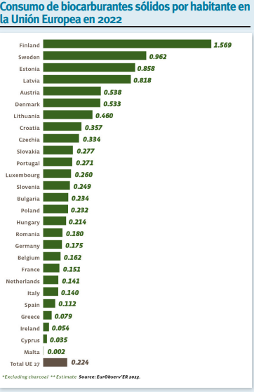 Este país industrializado, cuya combinación energética es una de las menos dependientes de los combustibles fósiles, cuenta con un 70 % del suelo forestal y el 28,5 % de su consumo energético procede de la madera. Finlandia es el primer productor de electricidad a partir de biocombustibles sólidos de la Unión Europea y el quinto mayor consumidor de biomasa de la Unión Europea con el mayor consumo de biomasa per cápita con 1,569 tep, por delante de Suecia con 0,962 tep per cápita. En total, las energías renovables representaron el 41,8 % de su consumo energético en 2022, muy por delante del petróleo (20,3 %), la energía nuclear (20,4 %), el carbón (6,4 %) o el gas natural (3,0 %).