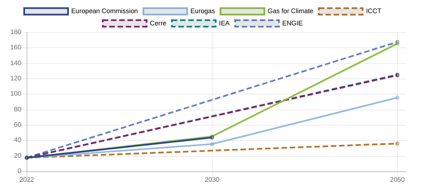 Existe consenso en que, para 2030, los sectores del biogás y el biometano combinados pueden duplicar con creces la producción, pasando de 18,4 bcm en 2021 a aproximadamente 35-45 bcm en 2030. Para 2050, la producción puede quintuplicarse como mínimo con respecto a los niveles actuales, pasando a producciones de 95-167 bcm. La Comunicación y el Plan de Acción REPowerEU de la Comisión Europea incluyen la necesidad de aumentar rápidamente la producción de biometano para alcanzar los 35 bcm en 2030 y crear las condiciones previas para un mayor aumento de su potencial en 2050, con el fin de aumentar la seguridad energética de la UE.
