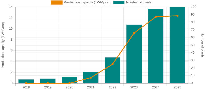 Figura 4.2. Evolución actual y futura del número de plantas de Bio-LNG y capacidad de producción (TWh/año), 2018-2025.