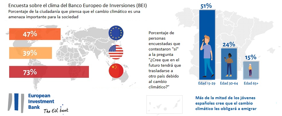 A escala mundial, el cambio climático también se percibe como uno de los principales retos en otras áreas del mundo, en diferentes grados: el 73% de los ciudadanos chinos considera que el cambio climático es uno de los mayores desafíos a los que se enfrenta la sociedad, muy por delante de los europeos (47%) y de los estadounidenses (39%). Los datos de la encuesta también muestran que los chinos son mucho más optimistas que los habitantes de otras regiones: el 80% de los chinos cree que todavía es posible revertir el cambio climático, mientras que solo el 59% de los europeos y el 54% de los estadounidenses comparten este optimismo. A pesar de su optimismo general sobre la resolución de la crisis climática, la población española es más proclive que el conjunto de los europeos a pensar que tendrán que emigrar en el futuro, tanto dentro como fuera de España, como consecuencia del cambio climático. El 36% (10 puntos por encima de la media europea) cree que tendrá que trasladarse a un país o región más frío en el futuro. La generación más joven lo considera un problema especialmente grave: más de un 60% cree que tendrá que mudarse a zonas más frías del país o al extranjero debido al cambio climático.