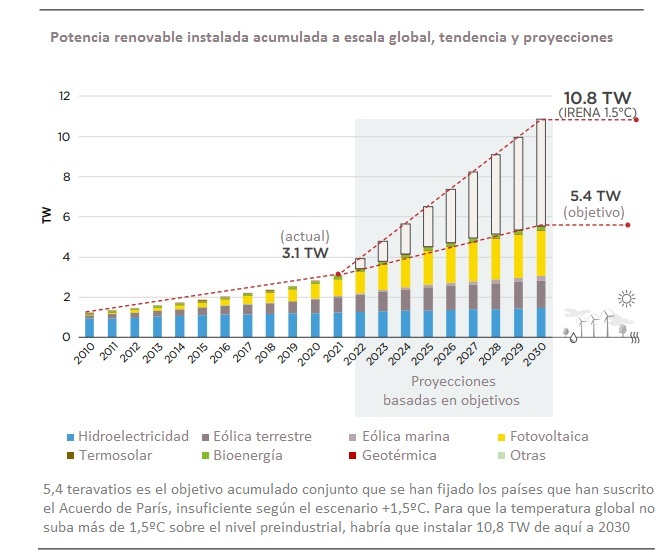 El nuevo análisis de Irena señala que, para 2030, los países se han marcado el objetivo de alcanzar una capacidad de generación eléctrica renovable instalada de 5.400 gigavatios. Esta cifra solo sería la mitad de los 10.800 MW de capacidad instalada que hacen falta según el escenario de 1,5°C de Irena. Según la Agencia, "para conseguir la neutralidad climática, el objetivo de capacidad de generación eléctrica renovable marcado para 2030 tendría que duplicarse en comparación con el nivel de ambición expresado en los objetivos actuales".