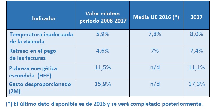 Para medir la pobreza energética, la Estrategia ha tomado los indicadores primarios determinados en el EPOV (Observatorio Europeo de Pobreza Energética), que son: