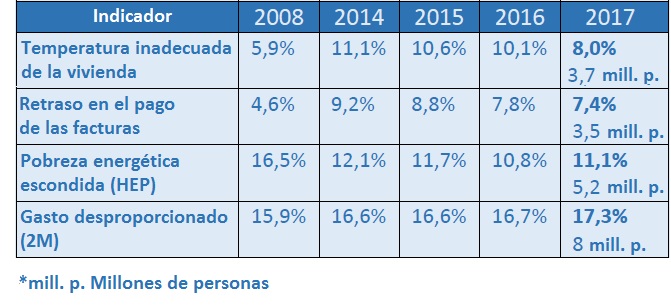• La incapacidad para mantener el hogar a la temperatura adecuada. [La información del estado de estos indicadores en España se obtiene de la Encuesta de Presupuestos Familiares y la Encuesta de Condiciones de Vida del Instituto Nacional de Estadística (INE). Según el indicador empleado, es posible determinar que entre 3,5 y 8 millones de personas se encuentran en situación de pobreza energética en España en sus diferentes manifestaciones].