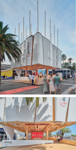 El principal material del pabellón es madera de pino procedente de bosques con certificación de gestión sostenible que absorbió durante su ciclo de vida más de 70 toneladas de CO2. En concreto, la mitad de la madera está siendo reutilizada y proviene de un evento anterior, al igual que todos los materiales textiles empleados en su construcción. Otra característica definitoria del pabellón de Acciona Energía es que incorpora en su estructura cuatro palas de aerogenerador procedentes del parque eólico gaditano de El Cabrito, un complejo eólico repotenciado en Tarifa. Cada una de estas palas evitó la emisión de 2.045 toneladas de CO2 durante su vida útil, y ahora son un ejemplo de cómo dar una segunda vida a los componentes de los aerogeneradores en nuevas construcciones.