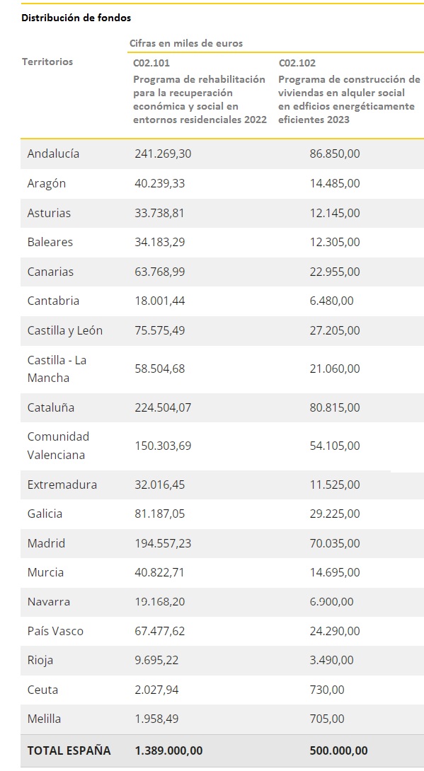 La distribución territorial de estos 1.889 millones de euros se sumará a los 1.151 millones de euros del programa de rehabilitación residencial transferidos en 2021 por el Ministerio de Transportes, Movilidad y Agenda Urbana a las comunidades autónomas, Ceuta y Melilla y a los 500 millones del programa de vivienda social traspasados en 2022. Todo ello, según la distribución acordada en la Conferencia Sectorial de Vivienda y Suelo del 21 de julio de 2021.