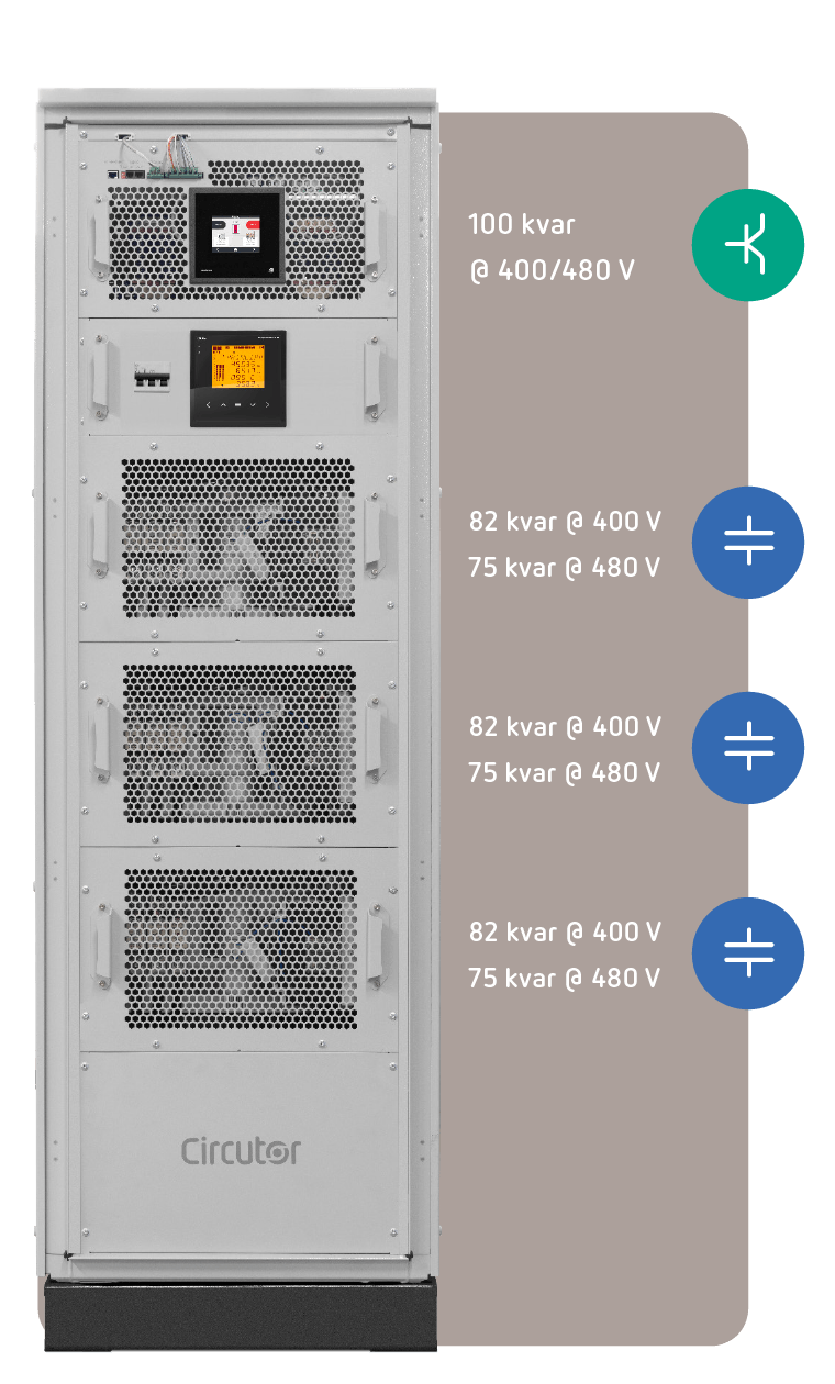 En términos de tamaño, ocupa mucho menos espacio que una batería de condensadores tradicional. Además, incorpora en su estructura la compensación activa, de manera que se evita la instalación de un equipo de compensación adicional y permite reducir su tamaño significativamente.
