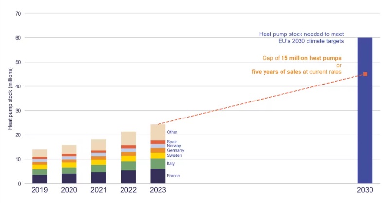 En concreto, en las proyecciones de la EHPA, la tendencia actual muestra que el objetivo de 60 millones de bombas de calor para calefacción de aquí a 2030 no se puede lograr, ya que a su parecer sólo se ejecutará el 75% del objetivo como máximo: 45 millones de sistemas. El 14 de mayo de 2024, unos quince Países de la UE, incluidos Francia, España, Dinamarca (Alemania, Países Bajos y Italia no fue signataria) había pedido la Comisión, a través de una comunicación informal (un documento oficioso conjunto) la inmediata publicación de un plan de acción sobre bombas de calor.