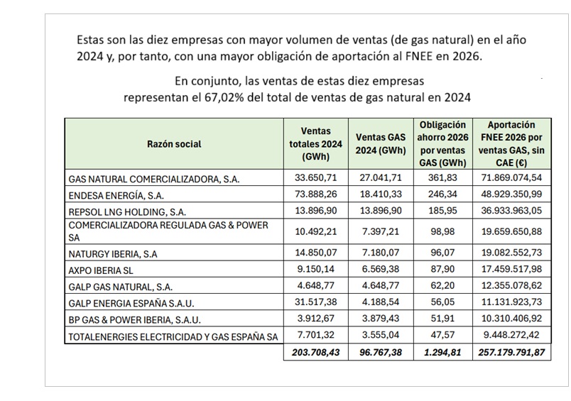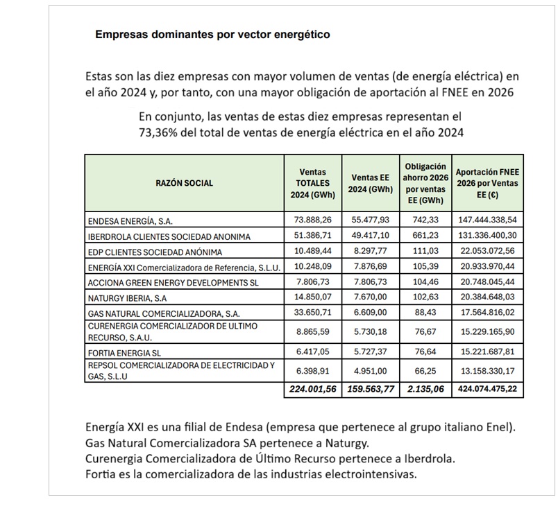 Las comercializadoras de gas y electricidad y los operadores de productos petrolíferos y de gases licuados de petróleo al por mayor deberán aportar 1.871 millones de euros al Fondo Nacional de Eficiencia Energética (FNEE) en 2026. Según se recoge en la propuesta de orden ministerial sometida a audiencia pública, de este importe, casi la mitad (46%) corresponderá a los operadores de productos petrolíferos, con 864,279 millones de euros; mientras que otros 578,037 millones de euros -el 30,9%- serán para las eléctricas; y 383,716 millones de euros -el 20,5%- para las gasistas. Entre las empresas con unas aportaciones más elevadas destacan Repsol, con más de 440 millones de euros entre sus distintas comercializadoras y operadores; seguido de Endesa, con unos 223 millones de euros; Moeve, con unos 220 millones de euros; Iberdrola, con más de 163 millones de euros; y Naturgy, con más de 161 millones de euros. También figuran entre los grandes contribuyentes al FNEE compañías como Galp, con unos 96 millones de euros; Disa, con más de 41 millones de euros; o BP, con más de 100 millones de euros.