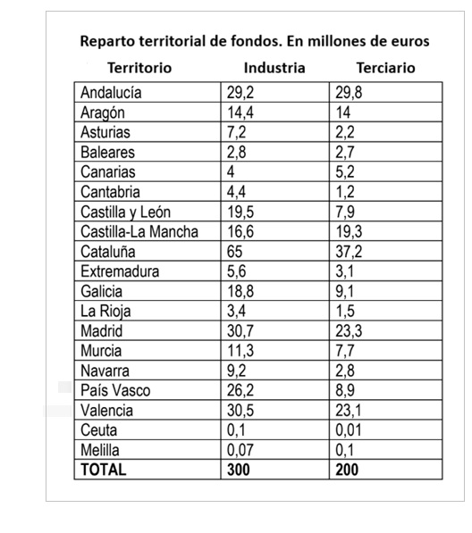 En el caso del Programa de eficiencia energética destinado a pymes y gran empresa del sector industrial, el acuerdo es destinar 300 millones de euros a la "mejora de la tecnología en equipos y procesos industriales, con ahorros superiores al 10%, y a la implantación de sistemas de gestión energética". Para el reparto objetivo de los 300 millones asignados se ha considerado la última estadística del INE sobre PIB a precios de mercado y valor añadido bruto a precios básicos por ramas de actividad.