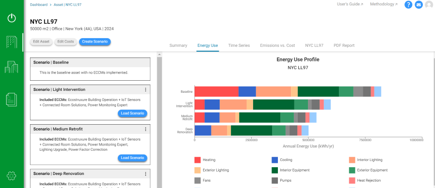 • Priorización de las medidas de modernización: la herramienta pone de relieve el impacto de las MCEE seleccionadas, ayudando a los usuarios a priorizar sus planes de modernización en función de las métricas financieras y de carbono. Esto incluye la ejecución de escenarios preestablecidos para intervenciones ligeras, reconversiones medias y renovaciones profundas.