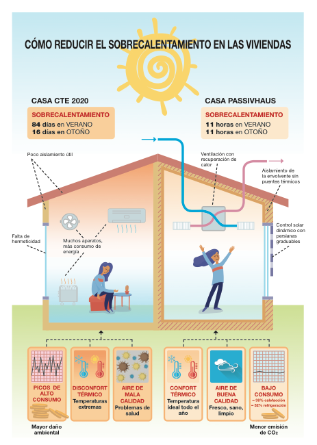 El informe sugiere que las medidas con criterios Passivhaus (sistema de ventilación de alta eficiencia, aislamiento continuo en toda la envolvente y persianas graduables que evitan la incidencia directa de la radiación solar) hay que implementarlas conjuntamente, y en su fase de diseño, para combatir el cambio climático y reducir la demanda energética y que el consumo de energía sea prácticamente nulo.