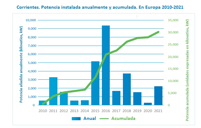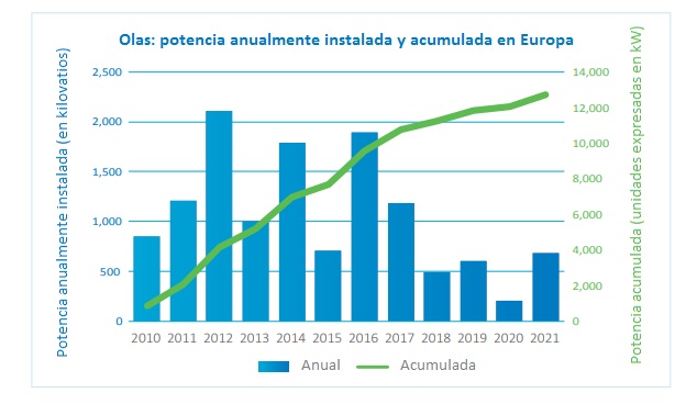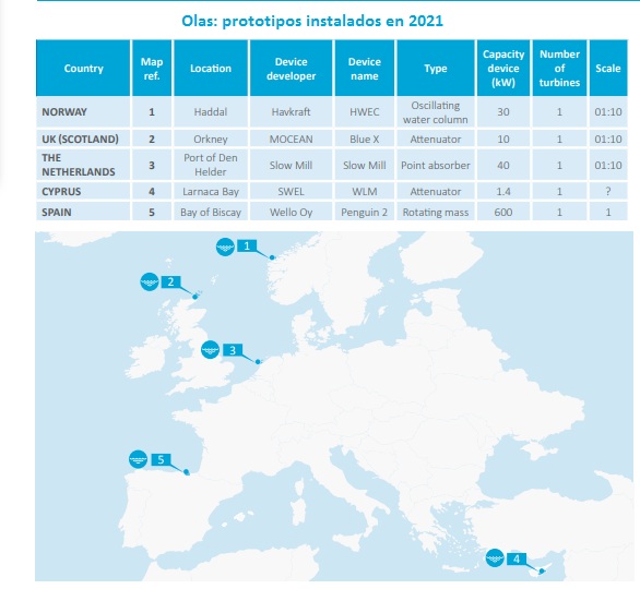 [Bajo estas líneas, gráfico extraído del Informe Anual 2021 que presentó el pasado mes de marzo Ocean Energy Europe, que es la red de profesionales del sector de las energías marinas más importante del mundo. Cuenta con más de 120 organizaciones, incluyendo compañías eléctricas líderes, agentes de la industria e institutos de investigación. Los gráficos siguientes también proceden de ese Informe]