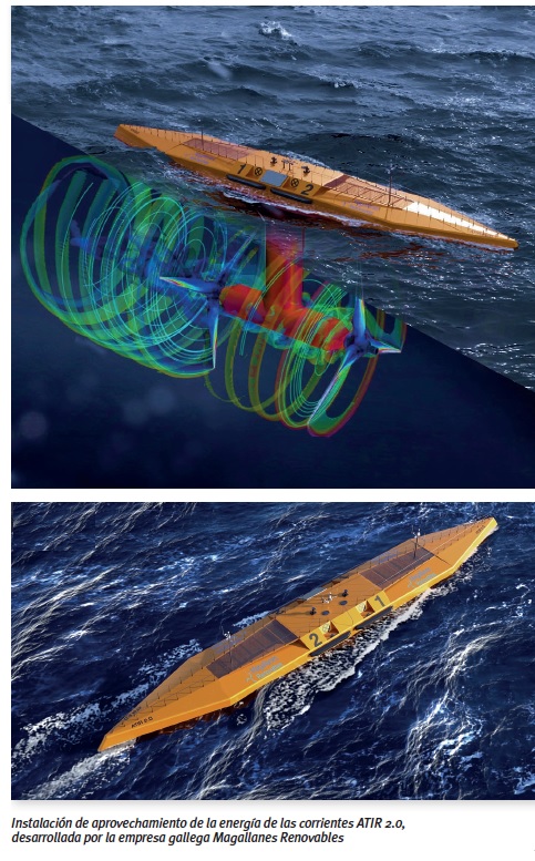 12. En cuanto a tecnólogos españoles, disponemos de un representante en energía de las corrientes (Magallanes Renovables) empresa que se ha dedicado a perfeccionar su tecnología durante más de 15 años. Esto le ha permitido mejorar cada versión de su dispositivo de extracción de energía mareomotriz y colocarse en la pole position mundial (véanse arriba infografía e imagen real de su dispositivo ATIR 2.0).