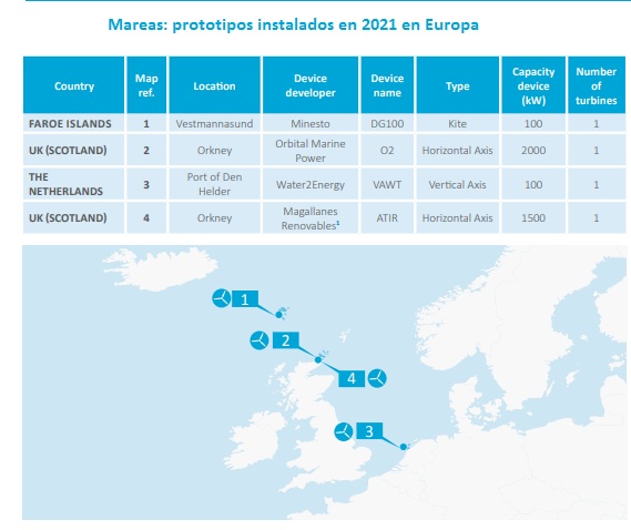OEE recoge en su Balance 2021 cinco turbinas, instaladas en ese curso, de entre 1,4 y 600 kilovatios. Los desarrolladores son Havkraft, que está probando un dispositivo con tecnología de columna de agua oscilante de 30 kilovatios en Noruega (escala 01:10); Mocean, que está ensayando un dispositivo (atenuador) de 10 kilovatios, escala 1: 10, en las Orcadas; Slow Mill (dispositivo absorbedor, 40 kilovatios, 1:10, Puerto de Den Helder); Sel (1,4 kilovatios, atenuador, en Chipre); y Wello Oy, que ensaya su prototipo Penguin, el más potente de todos ellos (600 kilovatios) en las aguas vascas de la Biscay Marine Energy Platform (escala 1:1, tecnología de masa rotante).